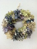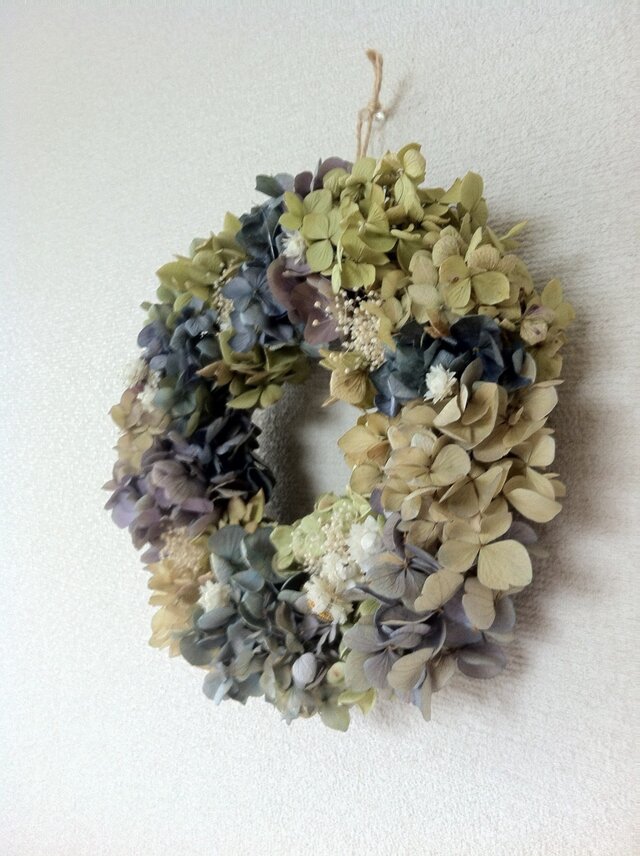 ブルー、グリーン、バイオレットなどのグラデーションが綺麗なあじさいと、アンモビューム、かすみ草のシンプルなリースです。