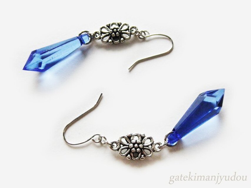 花モチーフのコネクターの下にサファイヤ色のシャンデリアに連なっているような長めのカット入り雫型のアクリルビーズが揺れるフックピアスです。