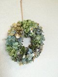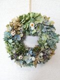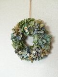 ブルー、グリーン、バイオレットなどのグラデーションが綺麗なあじさいと、アンモビューム、かすみ草のシンプルなリースです。