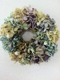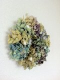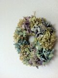 ブルー、グリーン、バイオレットなどのグラデーションが綺麗なあじさいと、アンモビューム、かすみ草のシンプルなリースです。