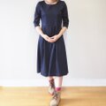 ・根強い人気の紺色。今回の生地は、シワになりにくく、型崩れしにくいシルケット加工が施された綿100%素材です。少しハリがあり、身体のラインを拾いにくいのが特徴。やや薄めの生地なので、軽量です。秋と春はもちろん、重ね着で肌寒くなるまでお使い頂けます。