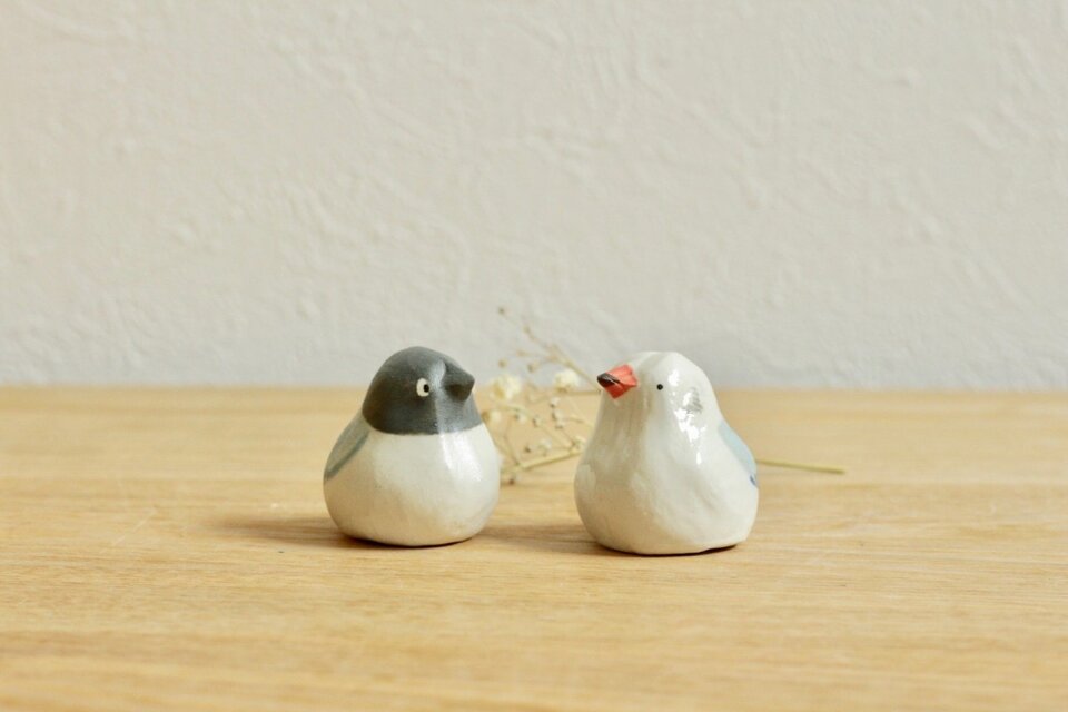 和菓子屋さんからゆずりうけたひよこまんじゅうの型にひとつひとつ土を込めて、ちいさなひよこを作りました。こちらは新作、ゆりかもめ。ゆりかもめは夏と冬でまったく違う顔をもつ不思議な鳥です。夏鳥は頭に黒い頭巾をかぶったような姿になるのだそう!その姿があまりにもかわいいので、作らずにいられませんでした。2匹セットで販売しています。