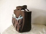 チョコレートブラウンリネンにイギリスリバティプリントのポケットをつけたバッグ