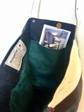 持ち手/白革ベルト(ダメージ) 底面/濃色デニム 正面/使えるデニムポケット大小各1個(刺繍)&倉敷帆布ヴィンテージレッド・グリーン 裏面/同色グリーン&ダメージ加工デニム等 右サイド/深み茶色本革 内面/深みグリーン綿麻・ポケット2個・マグネットホック(10nintoiro®新仕様布タグ)※アンティークゴールドカシメ・リベット・多色使い糸・ロゴマーク等は全体のイメージに合わせてプラス