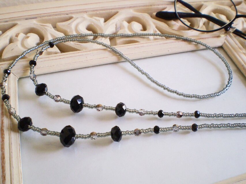 色は落ち着いたモノトーンでありながら、使ったビーズがそれぞれ程よく輝いてとても綺麗な眼鏡チェーンです。
