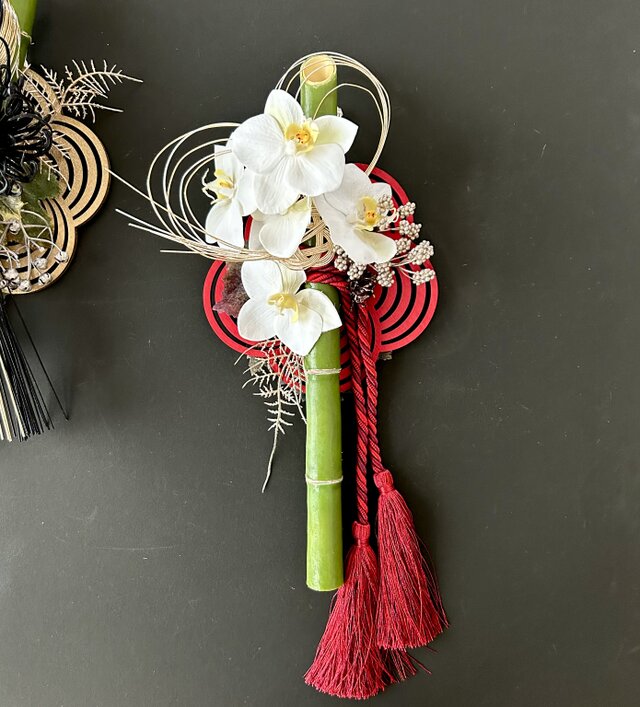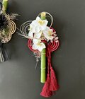 花材: アーティフィシャルフラワー青竹・ファレノ・かれん糸菊・ベリー・シダー・ウッドプレート・水引・タッセルなど