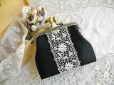 黒リネンにアンティークレースをのせたがま口ポーチ