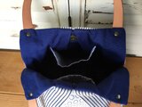 表(おもて)布には接着しんを付け、内布は帆布(11号)を使用していますので、かなりしっかりめのバッグとなっています。