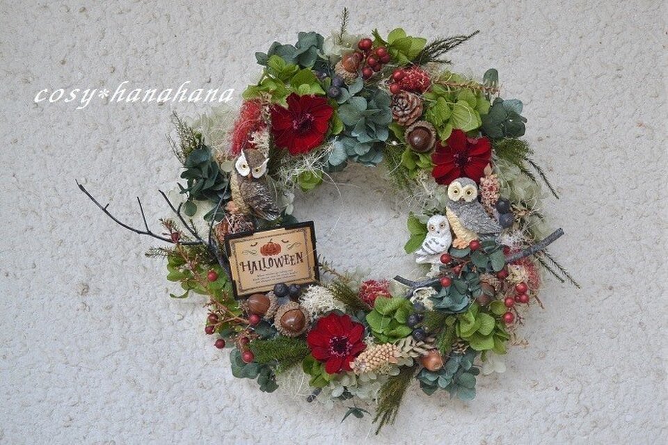 3羽のふくろうを入れたさりげないハロウィンリース。
