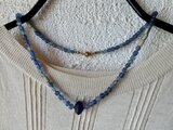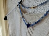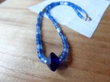 セミクリアのブルーの濃淡のあるおおらかなおおらかな優しい風合いのビーズに真鍮のビーズと合わせたベースに瑠璃色の産地の不明(ボヘミアorベネチアorオランダ)な平たいそろばん玉の古いビーズのトップとベネチアの古い(18C-19C)スジ玉をポイントにしてネックレスを仕立てました。