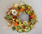 リース土台:ナチュラル素材 直径約20センチ リース素材:アーティフィシャルフラワ-(造花):マム・マーガレット・アストランティア・野いちご・アップル・紅葉リーフ・千日紅・房のまるい実、など。その他:細麻紐リボン飾り(枝に掛けてありますので取り外し可能)。