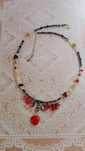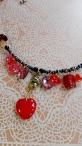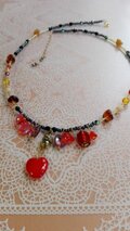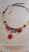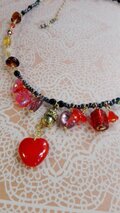 赤い素材を基本に、様々な形、色、丸小ビーズ、丸大ビーズ等を、ナイロンコートワイヤーに通して、仕上げた可愛いネックレスです。