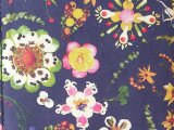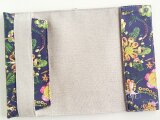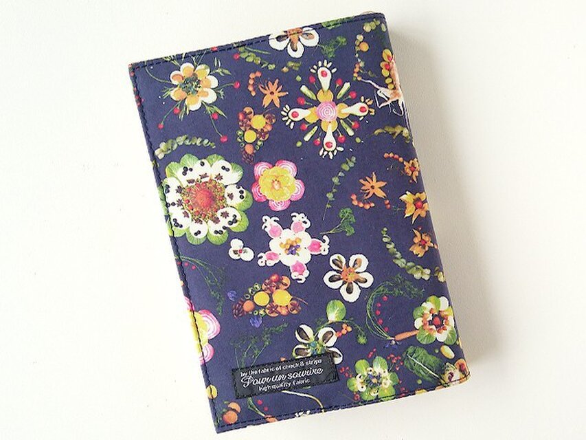 リバティの生地、 Synchronised Dinner シンクロナイズド ディナー(ネイビー)とハーフリネンの生地で文庫本サイズのブックカバーを作りました。