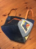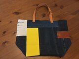 たくさんのデニムの配置、使いやすいポケットや内布の色あわせなど、こだわりのパーツ選び。横マチが広くキューブな形。A4サイズが入ります。両面の印象の違いとバッグを開いたときに、楽しくなることをコンセプトにした一点モノのデザインです。