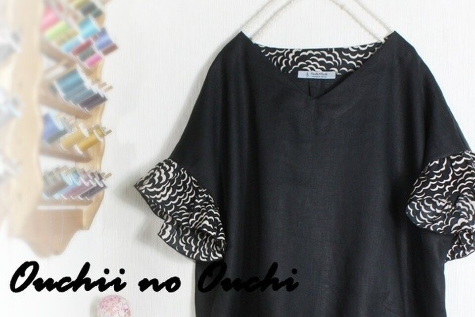 しっとりリネンブラック系とリバティタナローン大人気柄Puffパフブラックで巻きロックフリル袖のドロストブラウスをおつくりしました。