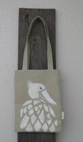 サイズはタテ31センチ、ヨコ23センチ、マチなし。持ち手の高さ(持ち手中央からカバン口中央)27センチ。薄着の季節なら持ち手を肩にかけられます。布用絵の具とペンキで愛想の良さそうなハシビロコウが見返るイラストを描いています。