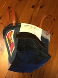 たくさんのデニムの配置、使いやすいポケットや内布の色あわせなど、こだわりのパーツ選び。横マチが広くキューブな形。A4サイズが入ります。両面の印象の違いとバッグを開いたときに、楽しくなることをコンセプトにした一点モノのデザインです。