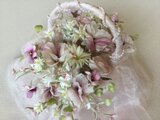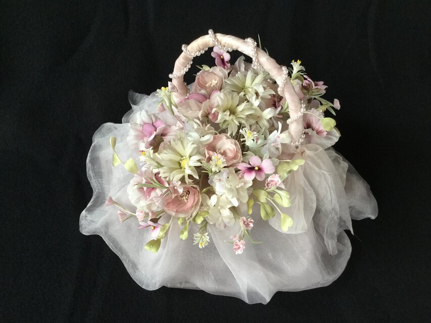 シルクの花籠に小花をいっぱい入れて華やかに作りました。
