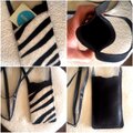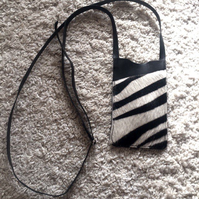 首掛け、斜め掛けできるスマホケースです。しっかりしつつも柔らかな革です。ポケットは白黒の牛ハラコでとてもおしゃれ。ゼブラ柄です。