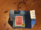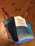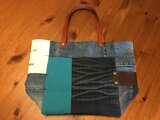 たくさんのデニムの配置、使いやすいポケットや内布の色あわせなど、こだわりのパーツ選び。横マチが広くキューブな形。A4サイズが入ります。両面の印象の違いとバッグを開いたときに、楽しくなることをコンセプトにした一点モノのデザインです。