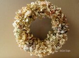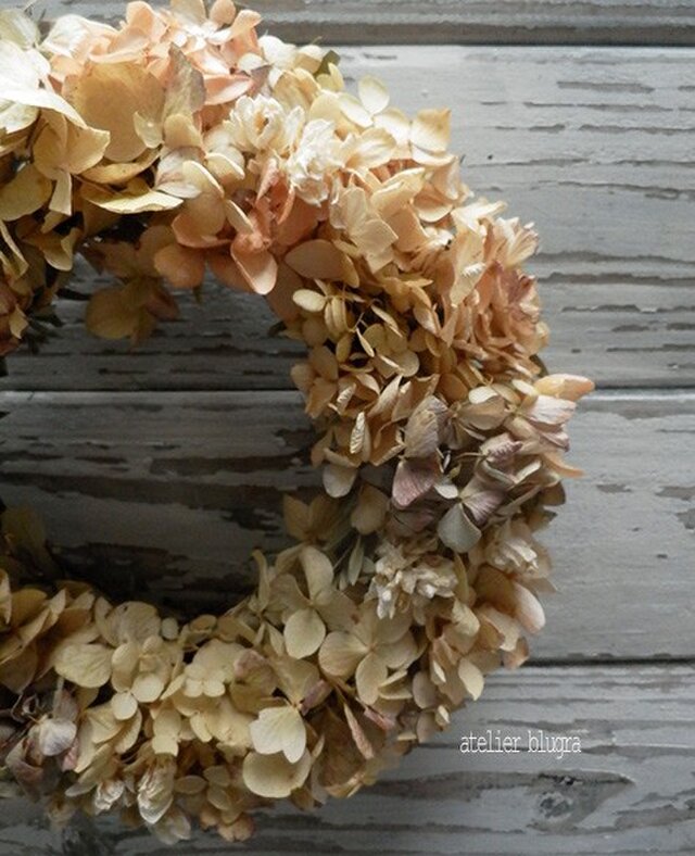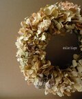 セピアカラーのアジサイがいっぱいの秋リースです。ハラハラと散り始めるまでの長い間、お楽しみいただけるリースです。漆喰壁など白い壁にとてもよく似合います。