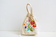 送料無料★手刺繍・スマホが入る持ち手付きカワイイ巾着です。
