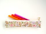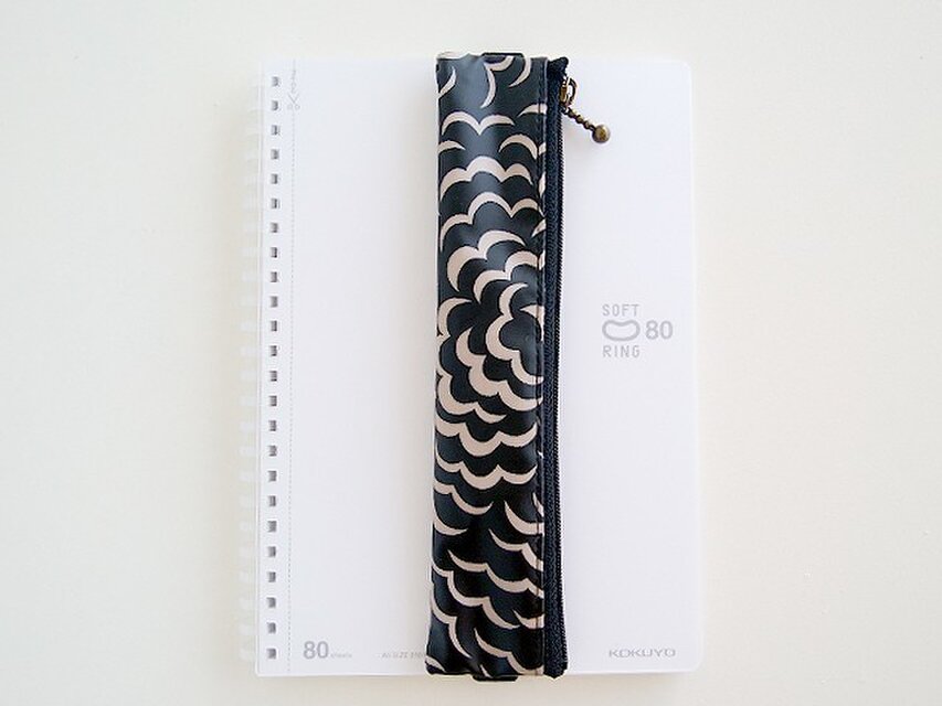 リバティの人気生地(ビニールコーティングつや無)、パフ Puff(黒にベージュ)でペンケース(A5サイズ用ゴムバンド付き)を作りました。
