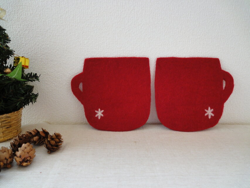 羊毛をシート状にしてマグカップの形をしたコースターを作りました