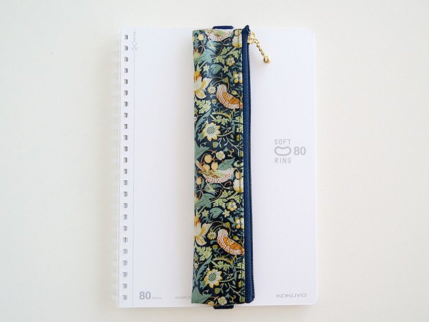 リバティの人気生地(ビニールコーティングつや無)、 Strawbery Thief ストロベリーシーフ(グリーン)でペンケース(A5サイズ用ゴムバンド付き)を作りました。