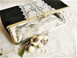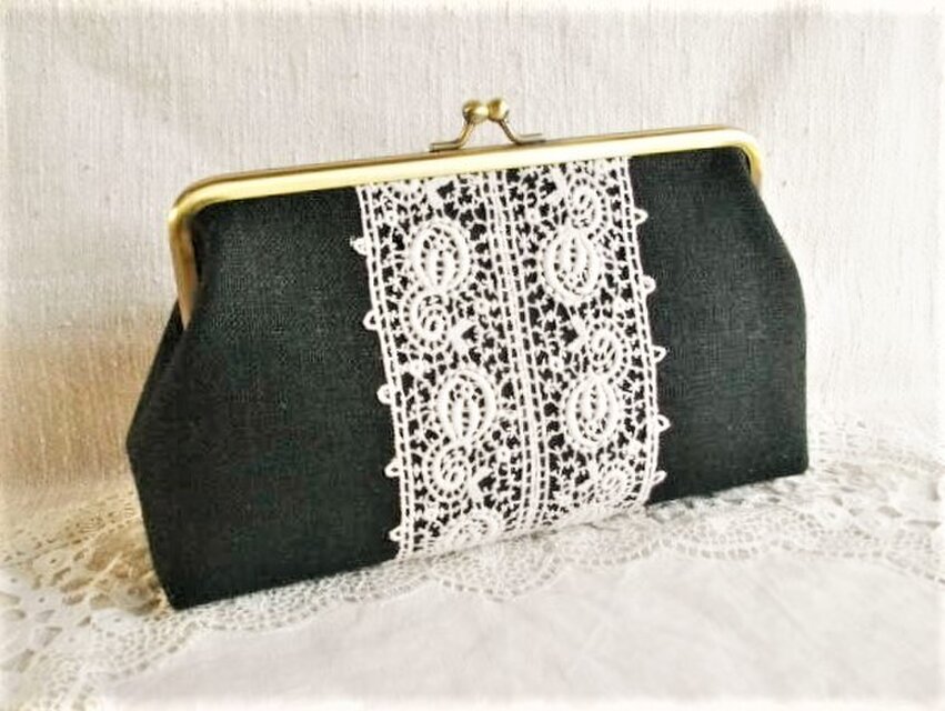 黒リネンとアンティークレースを組み合わせたがま口ポーチ
