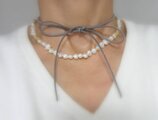 グレーの人工スエードのリボンで、シックなロングネックレスにしました。