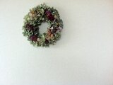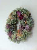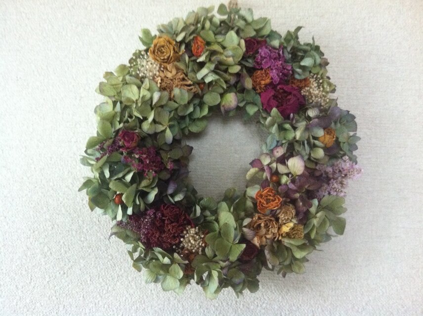 グリーン、ブルーなどの味わいのあるあじさいに、赤紫色の色合いのお花のシックなリースです。
