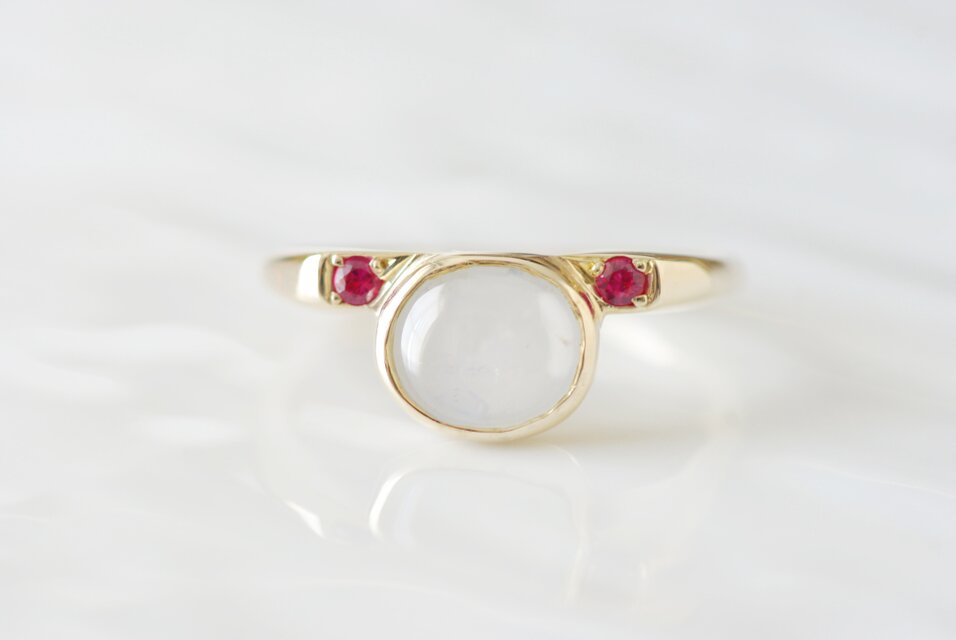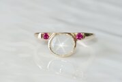 他の色が混ざらない半透明のホワイトスターサファイアは他の色とも相性が良く両サイドには同じコランダム系統のルビーを留めました。