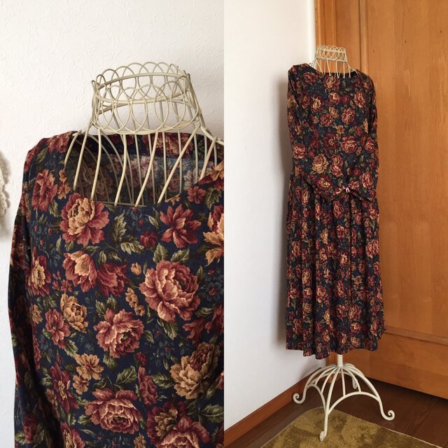 ☆総薔薇柄ロングギャザーワンピース紺☆