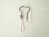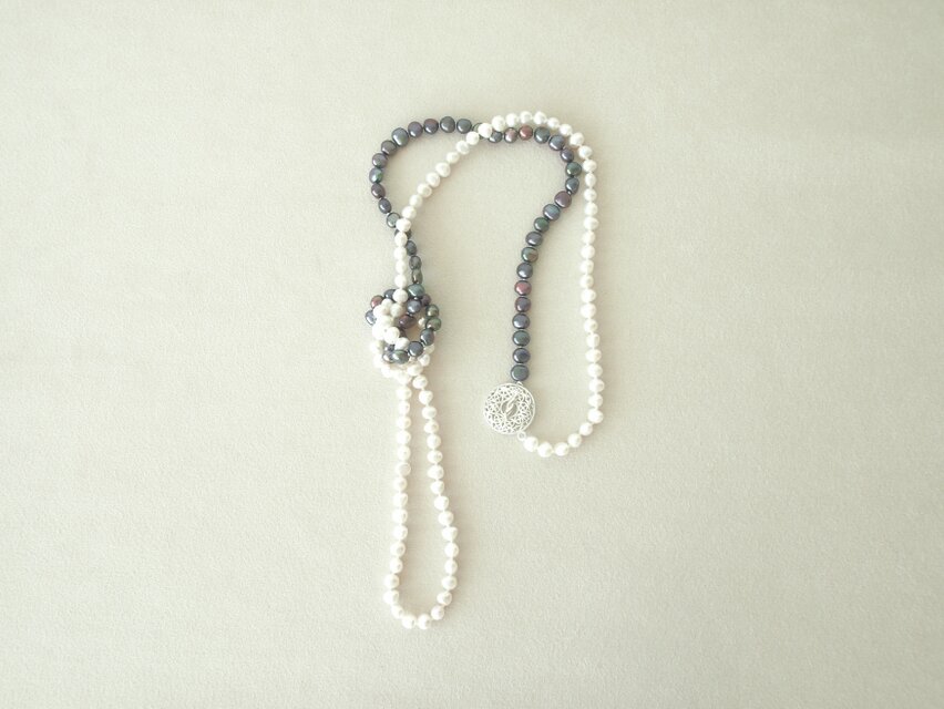真珠と真珠の間にはノットと呼ばれる結び目がすべて入ったオールノットで仕上げてあります。また、留具には透け感のあるシルバー925製のマンテルを使用して、華やかさと軽やかさを演出しました。