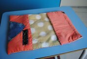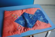 生地を手縫いでちくちくつなげ、世界に1つの本カバーを作りました。
