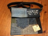 ショルダー紐/グレー&黒の布ベルト(アジャスター付き&長さ調節可能) 正面/使えるデニムポケット&倉敷帆布カーキ&生成り帆布とボタンアクセント(デザイナー手縫い刺繍糸) フタ面/手刷りステンシル 裏面/ヴィンテージ加工デニム等コラージュ 内面/黄緑&黒チェック柄 綿・マグネットホック※アンティークゴールドカシメ・リベット・多色使い糸ステッチ・ロゴマーク等は全体のイメージに合わせてプラス