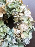 味わいのあるアンティークなあじさいと、かすみ草、ソーラーローズ、アンモビュームのシンプルでボリュームのあるリースです。