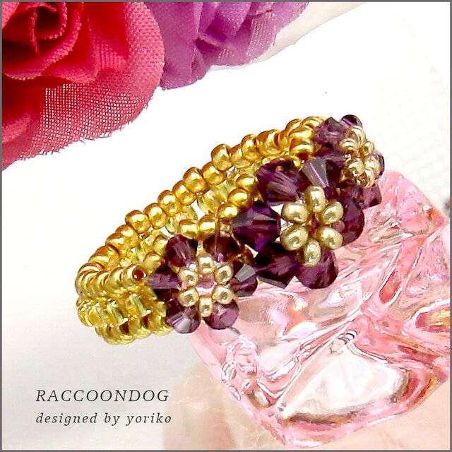 ビーズ,リング,コスチュームジュエリー,パープル,ビーズアクセサリー,ビーズアクセ,ビーズリング,紫,大人可愛い,アメジスト,むらさき,プレゼント,贈り物,スワロフスキー,花,フラワー
