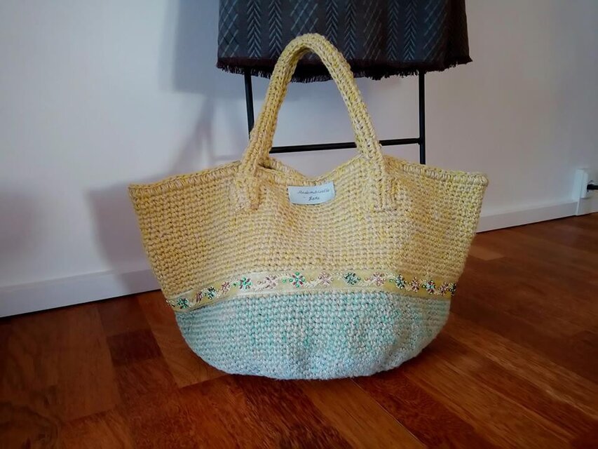 ★新作★クロシェット編みの大容量トートバッグ、丸底インド・キラキラテープ付★