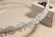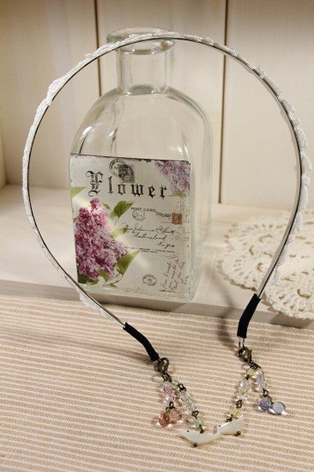 鉄製の細幅(5ミリ幅)カチューシャに白のケミカルレースをはりつけています。