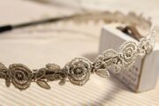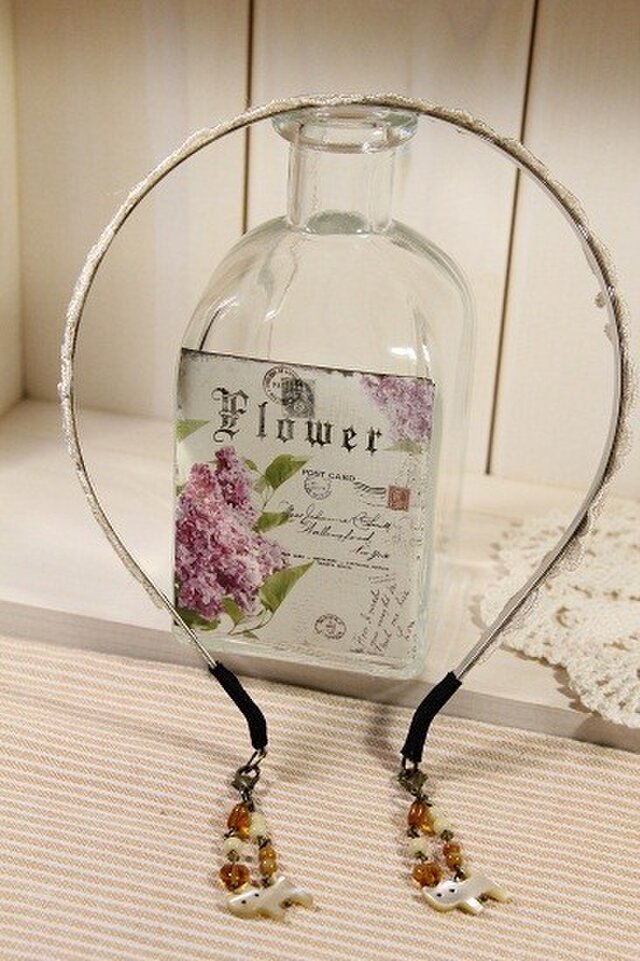 鉄製の細幅(5ミリ幅)カチューシャにベージュのケミカルレースをはりつけています。