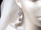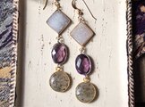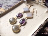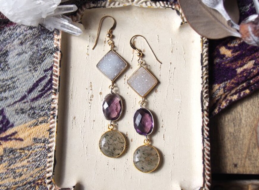 素材:ドゥルージークォーツ・アメジスト・エピドートインクオーツ・シルバー(石枠/ゴールドプレート)・真鍮・K14ゴールドフィルド(ピアス金具)