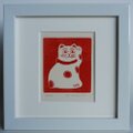 素敵な招き猫の銅版画が届きました。早速玄関に飾りました。 白い額縁に赤の背景白い招き猫はとても可愛く上品です。 左手を挙げる可愛い招き猫に来客が気付いてくれてたら嬉しいです。