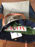 持ち手/茶本革 正面/ヴィンテージカーキ色帆布プリント大判 右サイド/艶茶本革&デニム 左サイド/ムラ染め緑色綿 裏面/使えるデニムポケット&ボタン&革紐留&カモフラ柄 内面/黄緑色と黒のチェック柄 綿・ポケット2個・マグネットホック(ブランド布タグ大) 底面/濃色デニム ※アンティークゴールドカシメ・リベット・多色使い糸・ロゴマーク等は全体のイメージに合わせてプラス