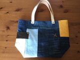 持ち手/白本革(ヴィンテージ新品(ダメージもデザインの一部です。) 右サイド/渋茶色本革&帆布生成り(手刷りシルクスクリーン) 右サイド/帆布クラシカルマスタード 正面/茶革数字ワッペン大5&ゴールド星スタッズ&ワッペン 底面/こなれ色デニム 裏面/こなれ色デニム各種&クラシカルライトブルー 内面/紫と黄色のチェック柄 綿・ポケット1個・マグネットホック※アンティークゴールドカシメ・リベット・多色使い糸ステッチ・ロゴマーク等は全体のイメージに合わせてプラス☆サイドのマチがタップリのパターン創作、キューブ型。A4サイズ入ります。