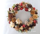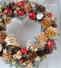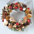 リース土台:ナチュラル素材 直径約20センチ リース素材:アーティフィシャルフラワ-(造花):コニファー・りんご・金色の実、など。自然素材:カラマツ、スターアニス・松かさ・シダローズ・ワタカラ・ハスの実、など。その他:リボンモチーフ・リボン飾り(リース左下のクリームとゴールドのリボンは、取り外しできません)、など。
