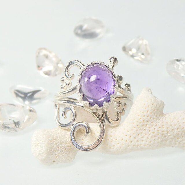 プックリとした形状のアメジストを唐草粒リングに飾り付けました。