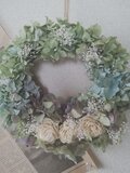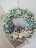 グリーン、ブルー、パープルなどの爽やかな色合いのあじさいに、ソーラーローズ、かすみそうをアレンジしたシンプルで可愛らしいリースです。