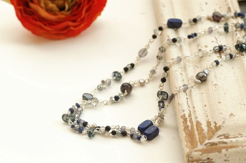淡水パールや青を基調とした天然石をアトランダムにつないだネックレスです。
